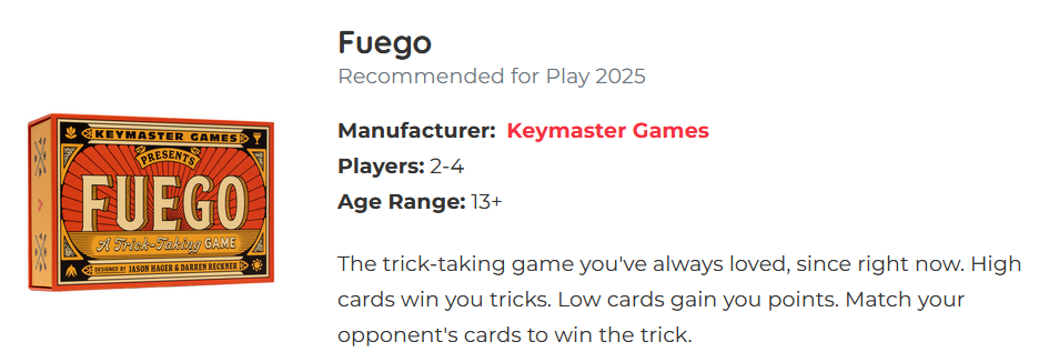 Fuego is a trick-taking game where two sides battle it out to to snuff out the opposing teams flames. High cards win tricks, but low cards steal flames from the other team. “Caliente, cards can be added to the round to, add a special condition for the round. Players then play a round of 8 tricks trying steal all the flames from on person on the other team. Strike tokens can modify cards, opponents cards can be countered to knock them out of the trick, and the round ends immediately when the flames run out . The first team take two rounds wins!